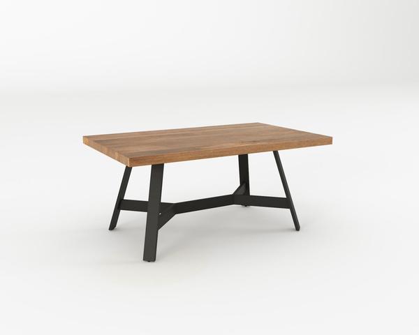 A dining table with iron legs combines durability with a modern, industrial aesthetic. The table typically features a wooden or glass tabletop, providing a sleek and functional surface for dining. The
